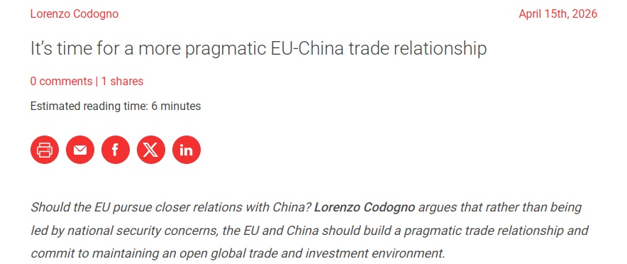 英国伦敦政治经济学院“欧洲政治”网站15日发表意大利经济与财政部前首席经济学家洛伦佐·科多尼奥的深度分析文章。这篇题为《是时候建立更务实的欧中贸易关系了》的评论指出,过去几年间,俄乌冲突、全球贸易战等多重冲击持续震荡世界经济版图,而近期美以对伊朗的军事行动更引发新一轮真正意义上的全球性能源危机。