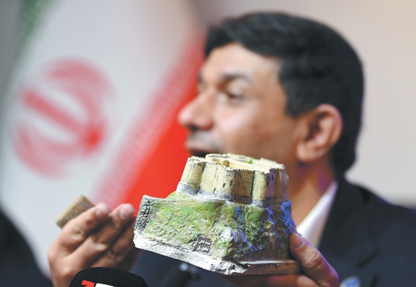 Hassan Fartousi, secretary-general of the Iranian National Commission for UNESCO, displays a miniature replica of Falak-ol-Aflak Castle, damaged by US and Israeli airstrikes, during a news conference in Tehran, Iran, on March 31. SHA DATI/XINHUA