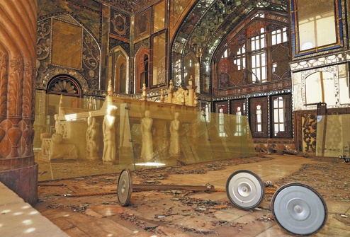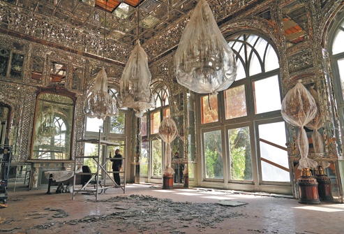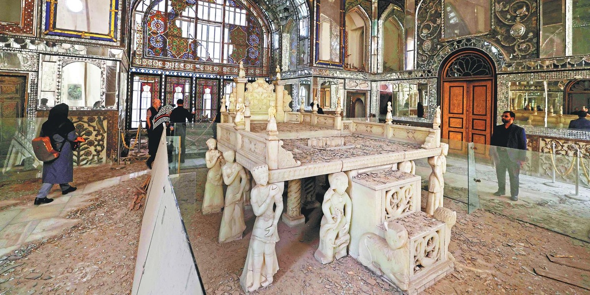 Visitors walk through the damaged interiors of Golestan Palace in Tehran, Iran, on April 4. ATTA KENARE/AFP