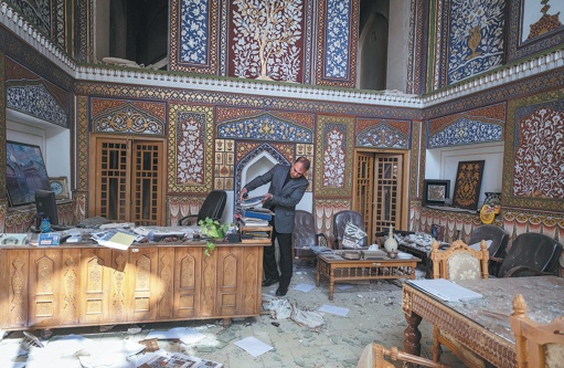 Broken glass litters a room damaged by a nearby airstrike at the Golestan Palace in Tehran, Iran, on April 5. FRANCISCO SECO/AP