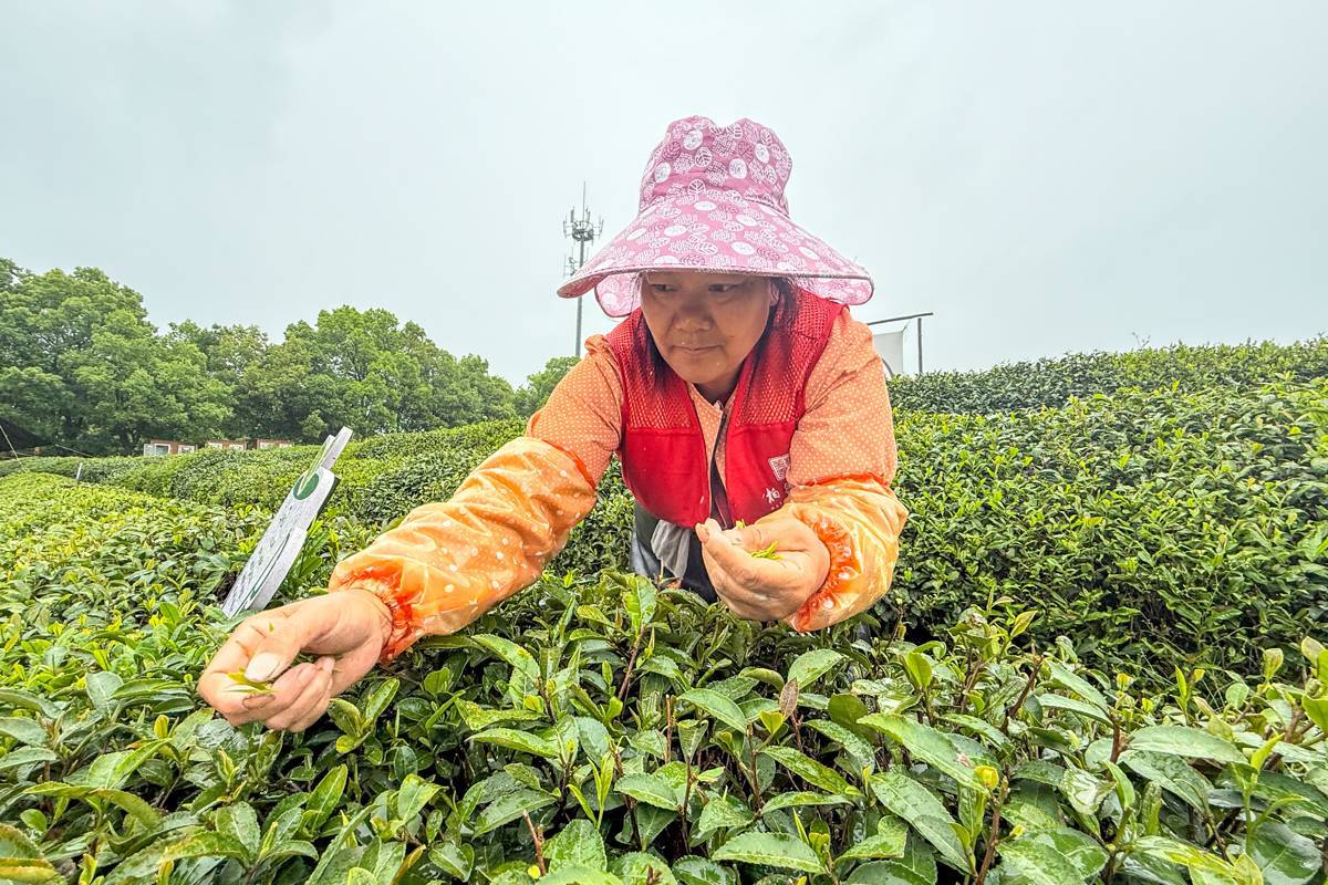 采茶工人采摘茶叶。