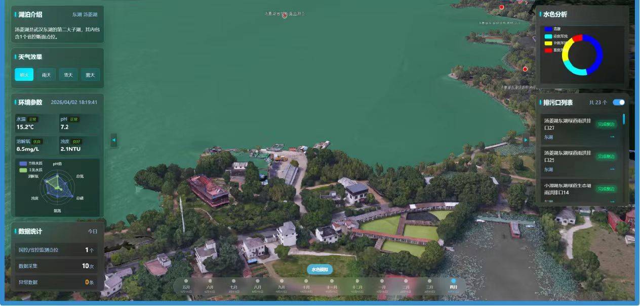 以美丽河湖特色应用为例,平台打造的排污口综合监管系统,紧扣“查测溯治管”全生命周期,为全省3.41万个排污口建立了“一口一档”精细化数字档案,让排污行为“看得见、管得住”。同时,对洪湖等重点流域进行专题展示,借助多维图表精准支撑治理决策。