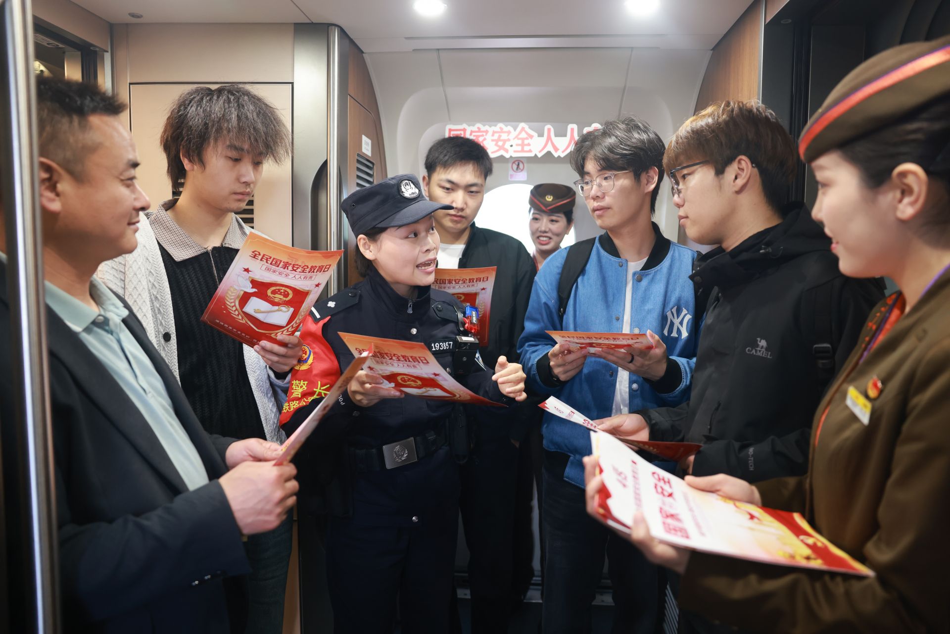 4月15日是第十一个全民国家安全教育日,今年主题为“统筹发展和安全 护航‘十五五’新征程”。当日,武汉铁路公安处乘警联合武汉客运段列车员,在动车组列车上开展主题宣传活动。