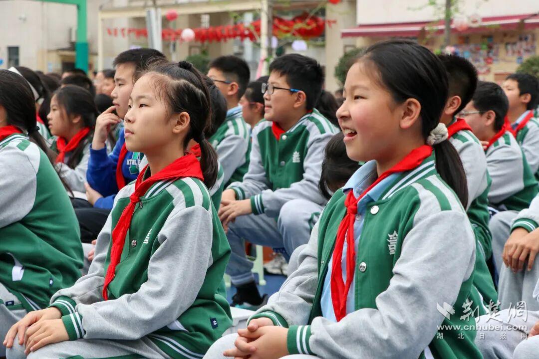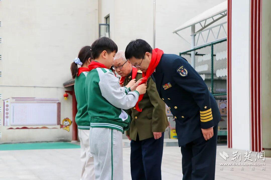 军休干部王德石、毕道增两位革命前辈在阵阵掌声中登场。全体少先队员列队敬礼,学生代表为两位前辈佩戴红领巾,表达敬意。