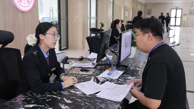 阿拉山口站货装车间货运员在国际联运楼内为客户办理进出口货物业务。布仁巴特 摄
