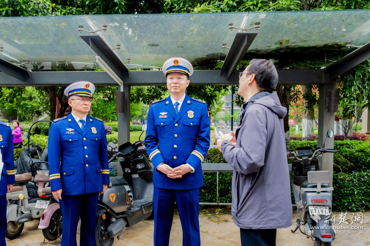 当日上午,董新明总队长一行来到东西湖区常青花园社区,深入城市运行管理中心了解微型消防站运行、网格化消防巡查、电动自行车集中充电管理及消防宣传教育工作。随后,实地检查楼栋下充电区车辆停放、充电棚耐火等级、烟感报警器覆盖范围和悬挂式干粉灭火装置维护情况,他对社区整合多方力量、推行“防消联勤”的做法给予肯定,并强调充电设施须达到“安全充”标准,电动车不要飞线充电、电池入户,物业要将消防提示海报张贴在居民视线平齐的显眼处。在听取建筑外墙外保温材料排查整治汇报后,他要求辖区大队和技术专家严格按照国家标准开展安全评估,对存在脱落风险、燃烧性能不达标的单位建立“一楼一档”,并明确整改责任时限。