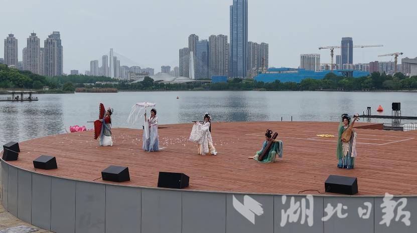 演出中,五位仙子身着民族传统服饰,携琴、琵琶、笛、箫等乐器,在月影舞台奏响音律,翩然起舞。邵山明表示,武汉自古有“高山流水遇知音”的佳话,是一座知音之城,希望通过这一创意设计,邀请全国游客来武汉共赴知音之约。