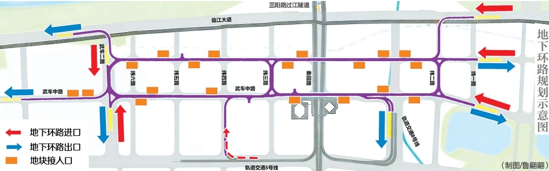 武昌滨江核心区楼宇林立,办公、商业密集度高,交通压力大。地下环路项目北至长江二桥,南抵绿地中心,东临和平大道,西靠临江大道,项目区域范围约138.64公顷。地下主线长3公里,匝道也是3公里,单向三车道,设计时速20公里,沿线设置11个接地出入口,还有“1进1出”连接长江公铁隧道。无论是从临江大道、徐家棚街,还是武车二路、武车中路,都能方便进出。