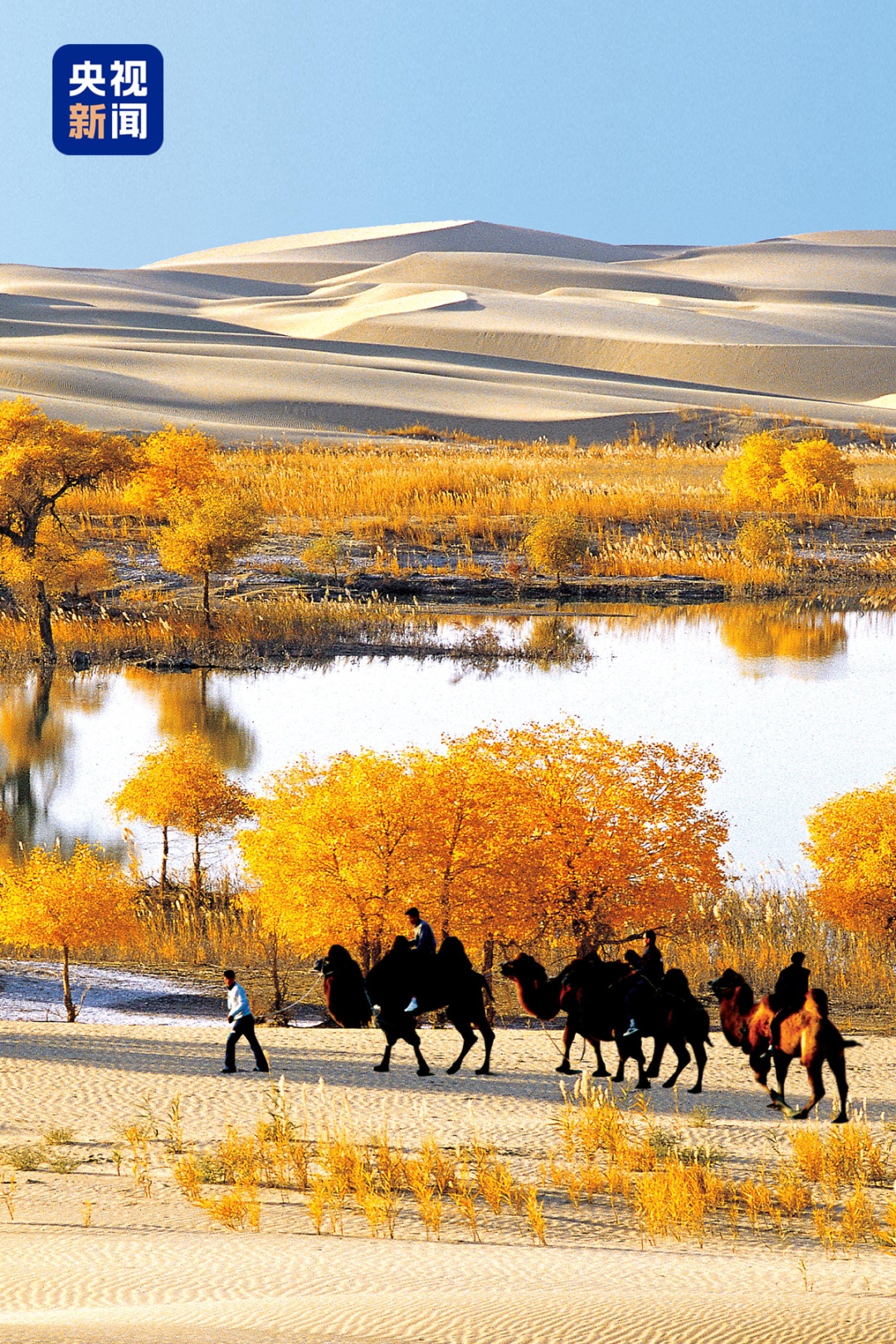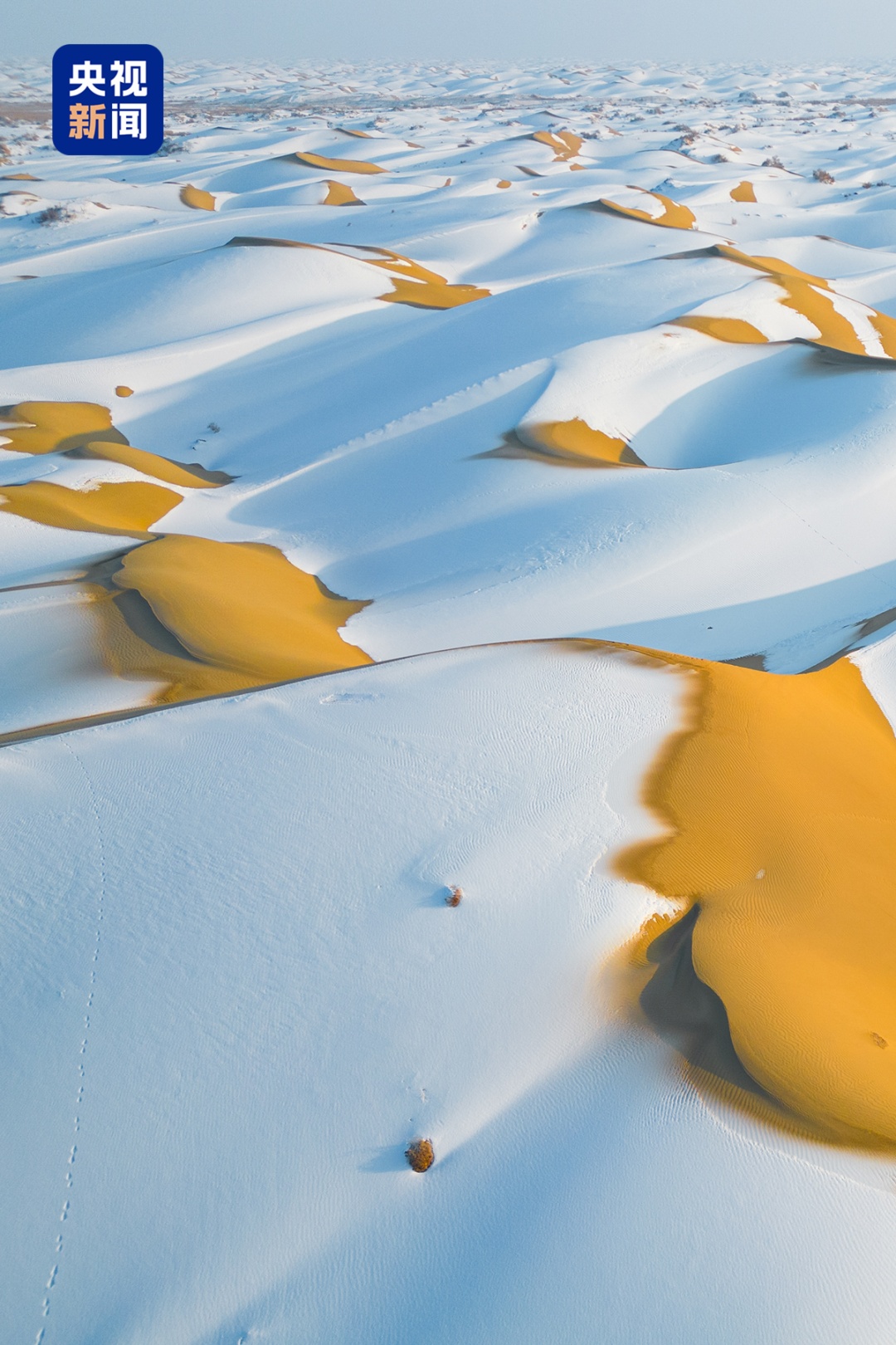 冬天,黄沙披上银装,高低起伏的沙脊与洁白的雪交织出独特的纹理。