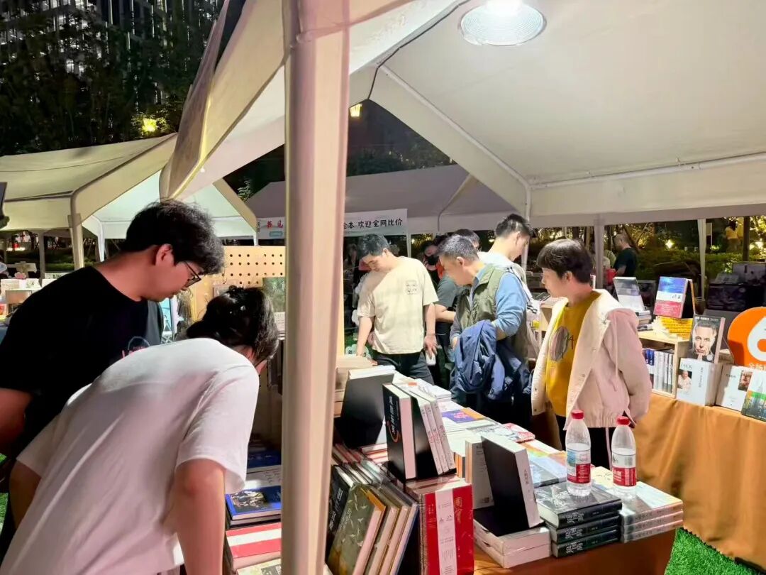 白日的书市热闹鲜活,夜幕降临后,这里便切换为温柔治愈的阅读秘境。露营天幕上的暖光灯缓缓亮起,柔和的光线漫过草地、拂过书架,将喧嚣轻轻抚平。不少读者特意趁着夜色前来,寻一把露营椅,捧一本心仪的书籍,在星光与灯光的交织中,沉浸式感受文字的力量。晚风轻拂,书香萦绕,每一盏灯下的阅读身影,都为这座城市的夜晚增添了一抹温润的文化底色。