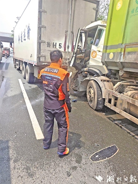 楚天都市报极目新闻讯(记者杨怡琴 陆缘 通讯员李鹏程 刘涛)4月17日中午,武汉三环线黄家棚天桥附近发生一起交通事故,一辆运垃圾的货车追尾前方大货车,驾驶室严重变形,司机受伤流血被困。危急时刻,路过的“红骑侠”刘涛、张小强、焦浩毫不犹豫靠边停车,分工协作实施救援。
