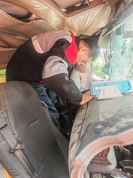刘涛第一时间拨打报警电话,报告事故准确位置,同时负责疏导现场交通,防止二次追尾;张小强和焦浩则冲向事故货车实施救援。货车司机被卡在变形的驾驶室里,口中大量流血。