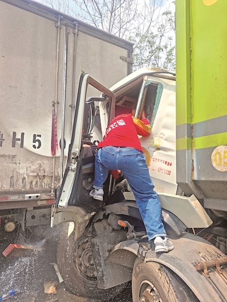 焦浩发现货车车窗紧闭,司机呼吸不畅,抬脚用力踢破车窗,让新鲜空气进入,也便于后续救援。三人又协调前方货车往前移动,尽量减轻对被困司机的挤压。