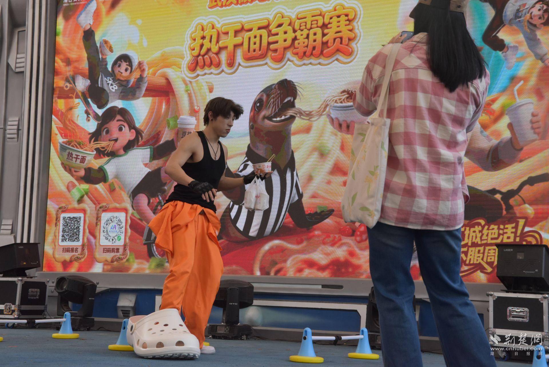 除趣味赛事外,园区同步奉上精彩演艺盛宴:非遗艺人展示顶杆绝技,复刻 MJ 经典舞步,搭配潮流歌舞、次元 Cos 及 NPC 互动巡游,现场还派送热干面试吃。传统非遗与潮流文化激情碰撞,为游客带来全方位沉浸式游玩体验。