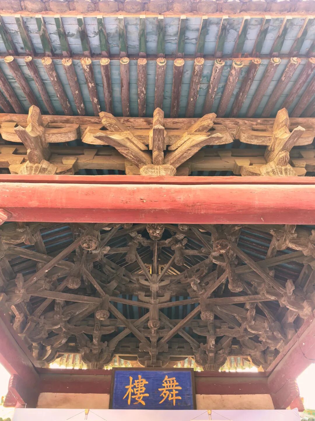 舞楼最独特的是戏台顶部的八卦藻井,没有一根大梁椽木,天井勾栏交榫不用一铆一钉,其细木交连,层层向上,构成穹顶。屋顶鸱吻为元代构件,琉璃瓦品为孔雀蓝色,十分珍贵。