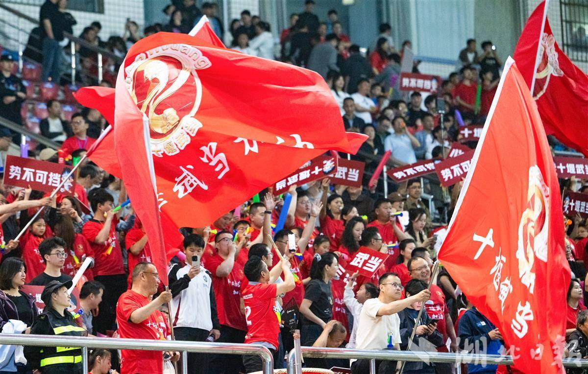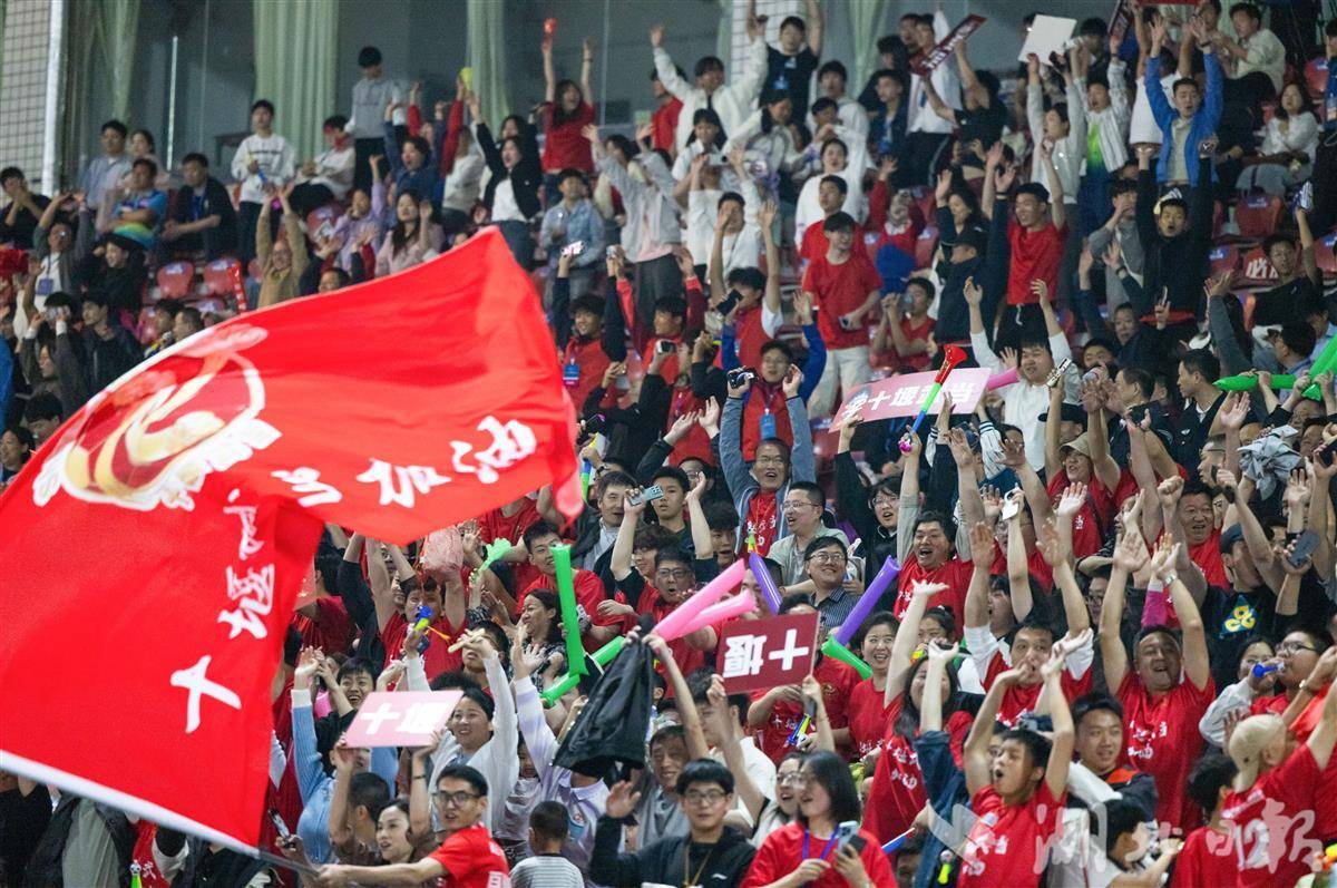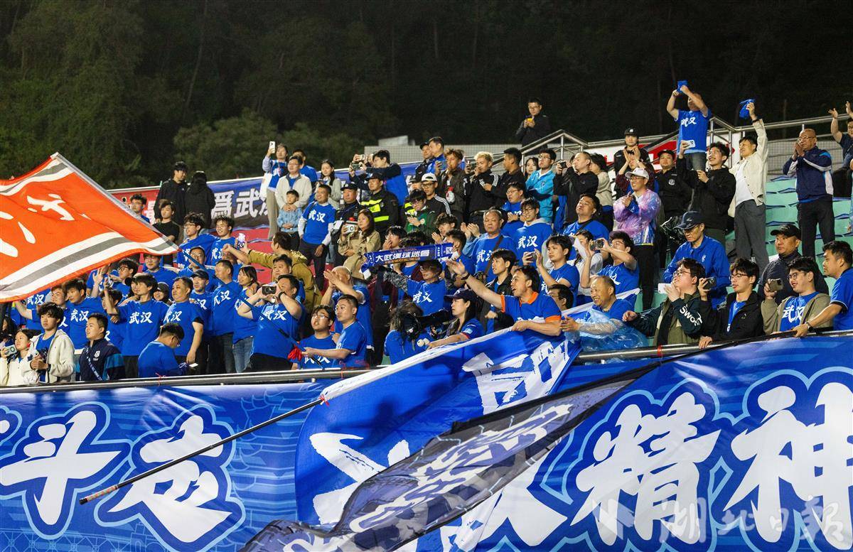 4月19日,武汉华工科技队首次亮相“楚超”,对阵十堰武当队。图为武汉球迷现场呐喊加油。