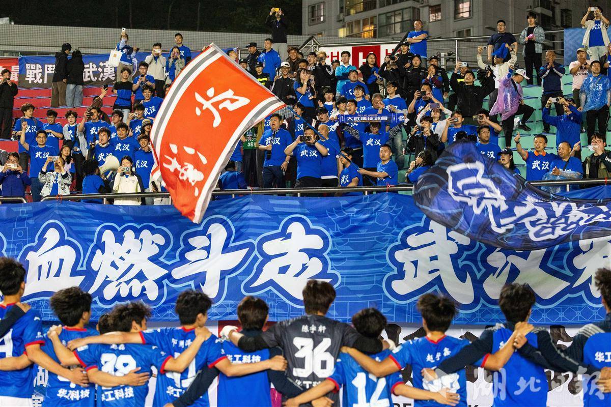 4月19日,武汉华工科技队首次亮相“楚超”,对阵十堰武当队。图为赛后武汉华工科技队与武汉球迷互动。
