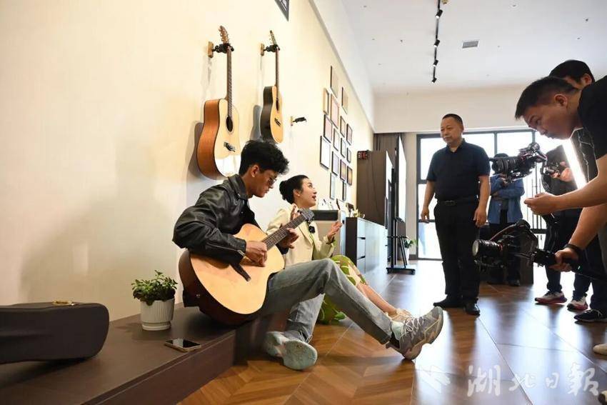 上午9点45分,青年博主们抵达市文化创新产业园。在观看城市宣传片后,大家走进桐馨乐器工厂,近距离观摩吉他制作的全过程,欣赏高端手工吉他,并与造琴大师深入交流,聆听每一把吉他背后的匠心故事。