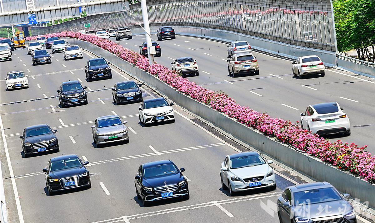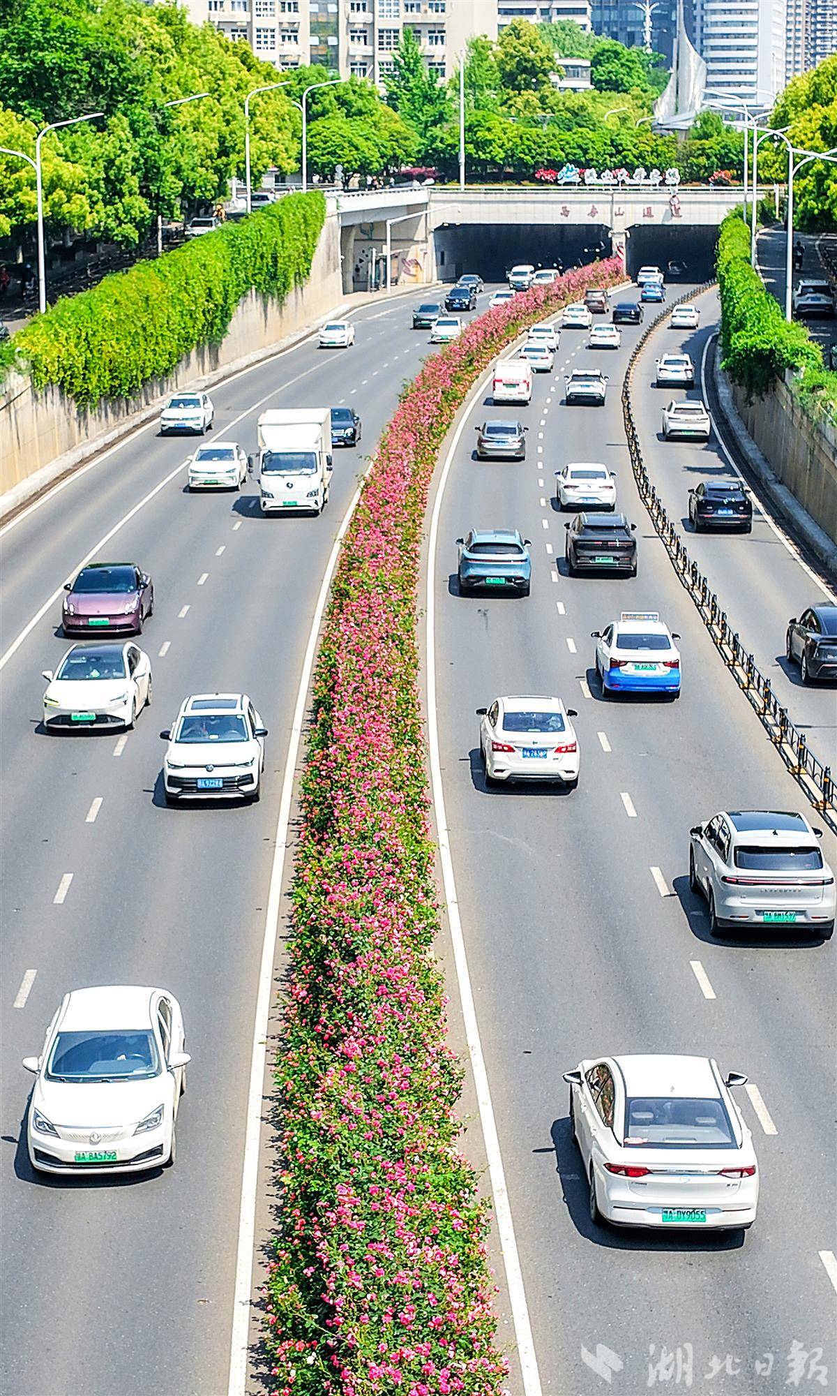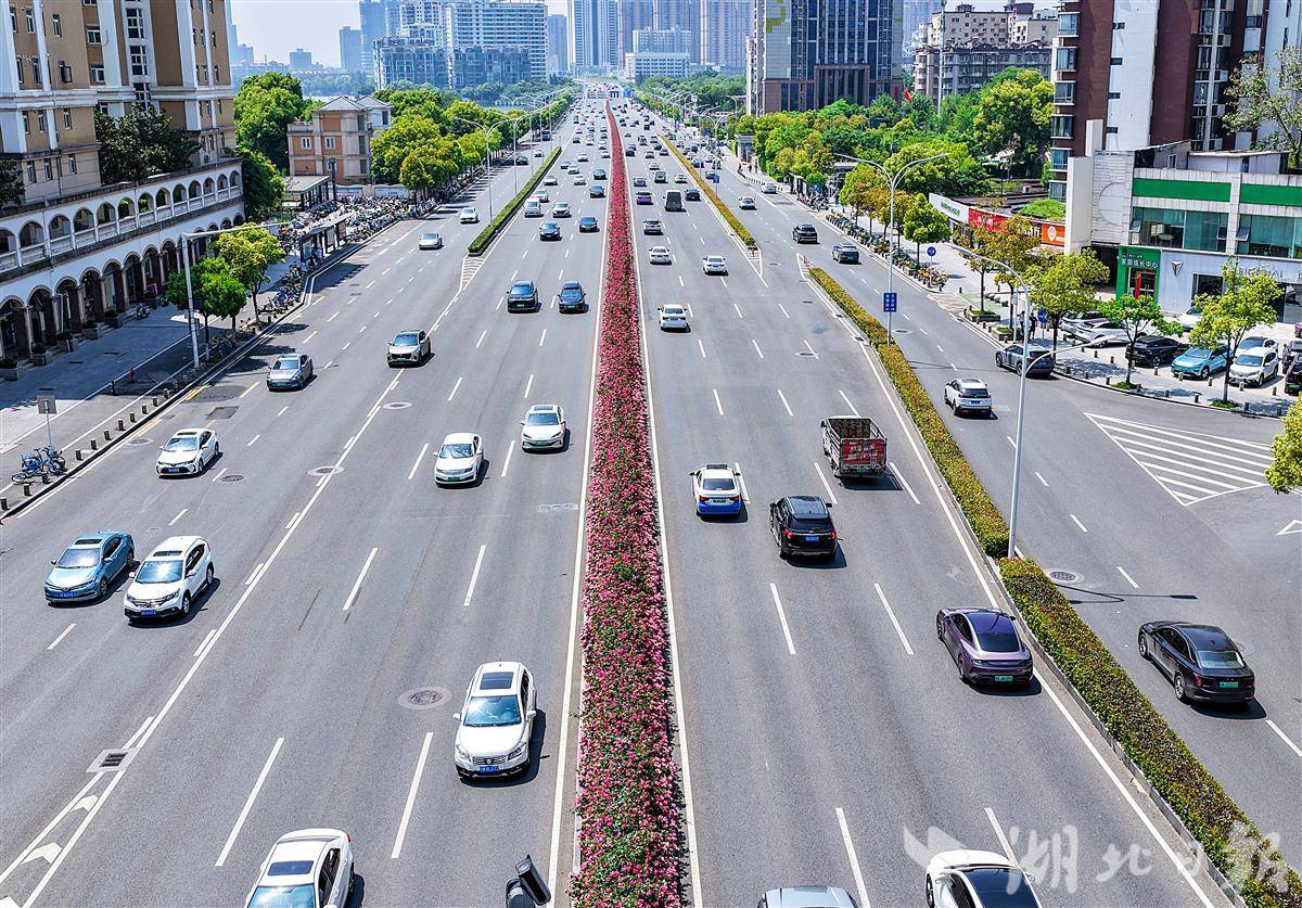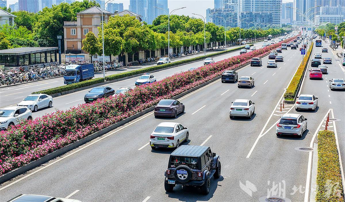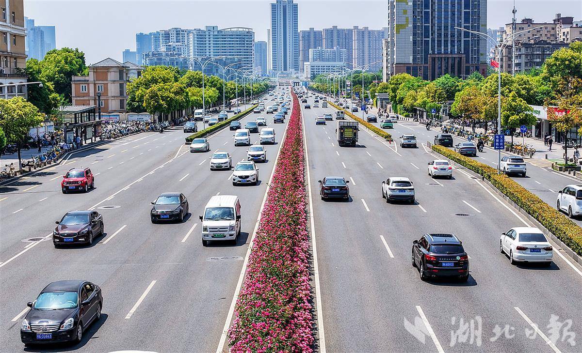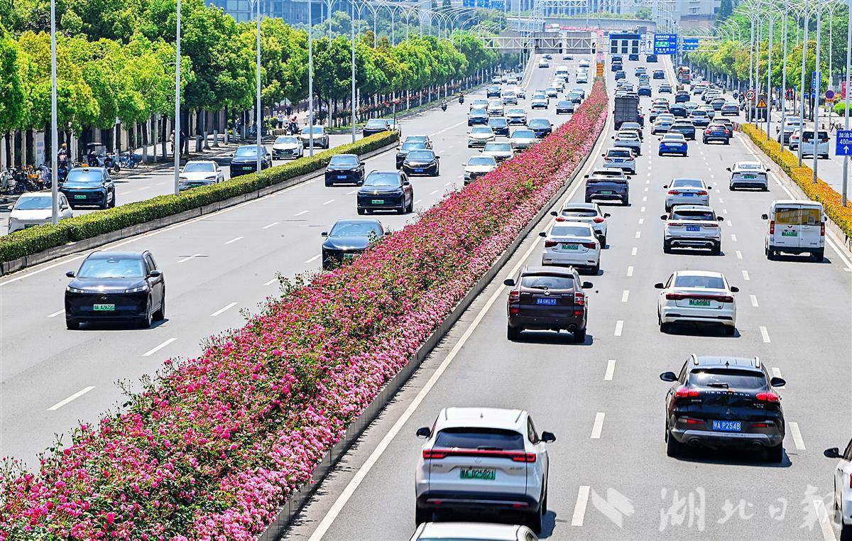 4月19日,鸟瞰武汉洪山珞狮南路5.5公里月季花带。