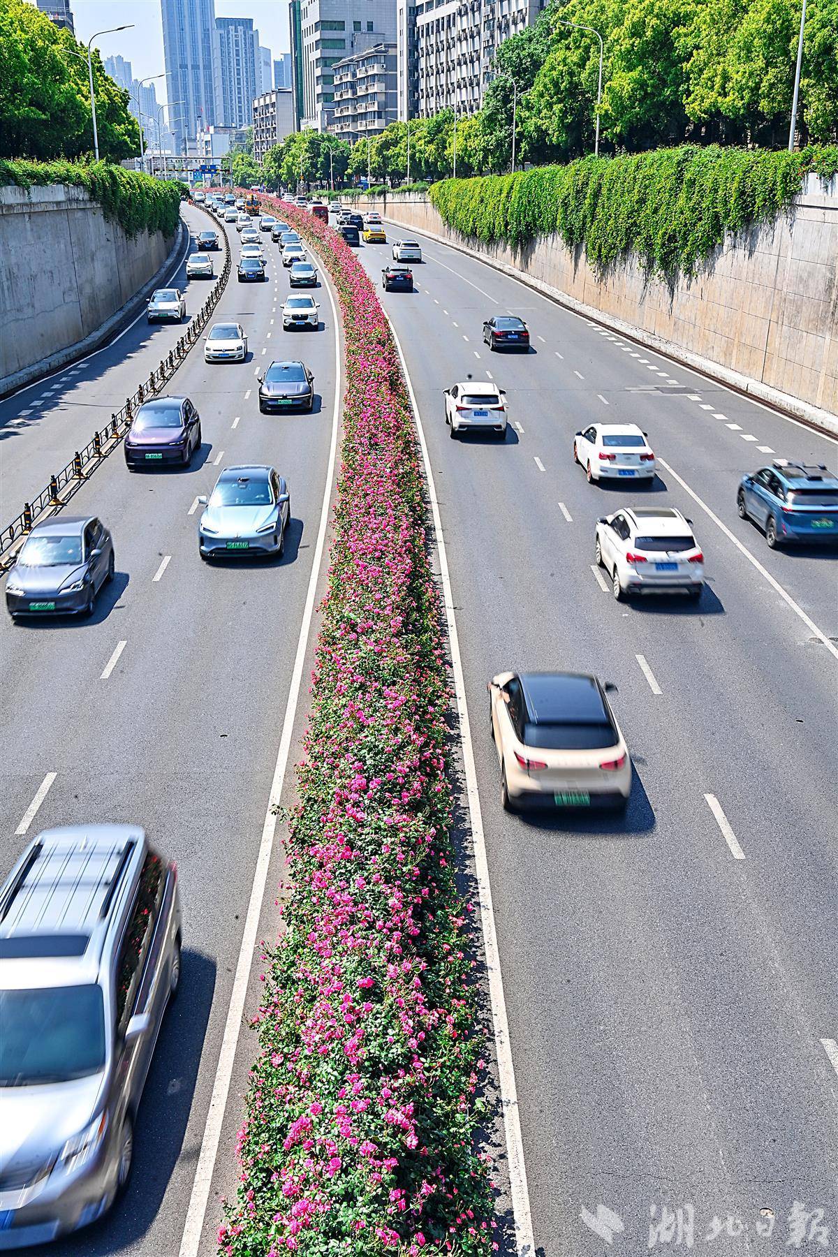 4月19日,鸟瞰武汉洪山珞狮南路5.5公里月季花带。粉嫩月季,花墙如瀑,一路吐芬芳,这是武汉道路月季最出彩的C位,也是浏览量最大的月季路段。