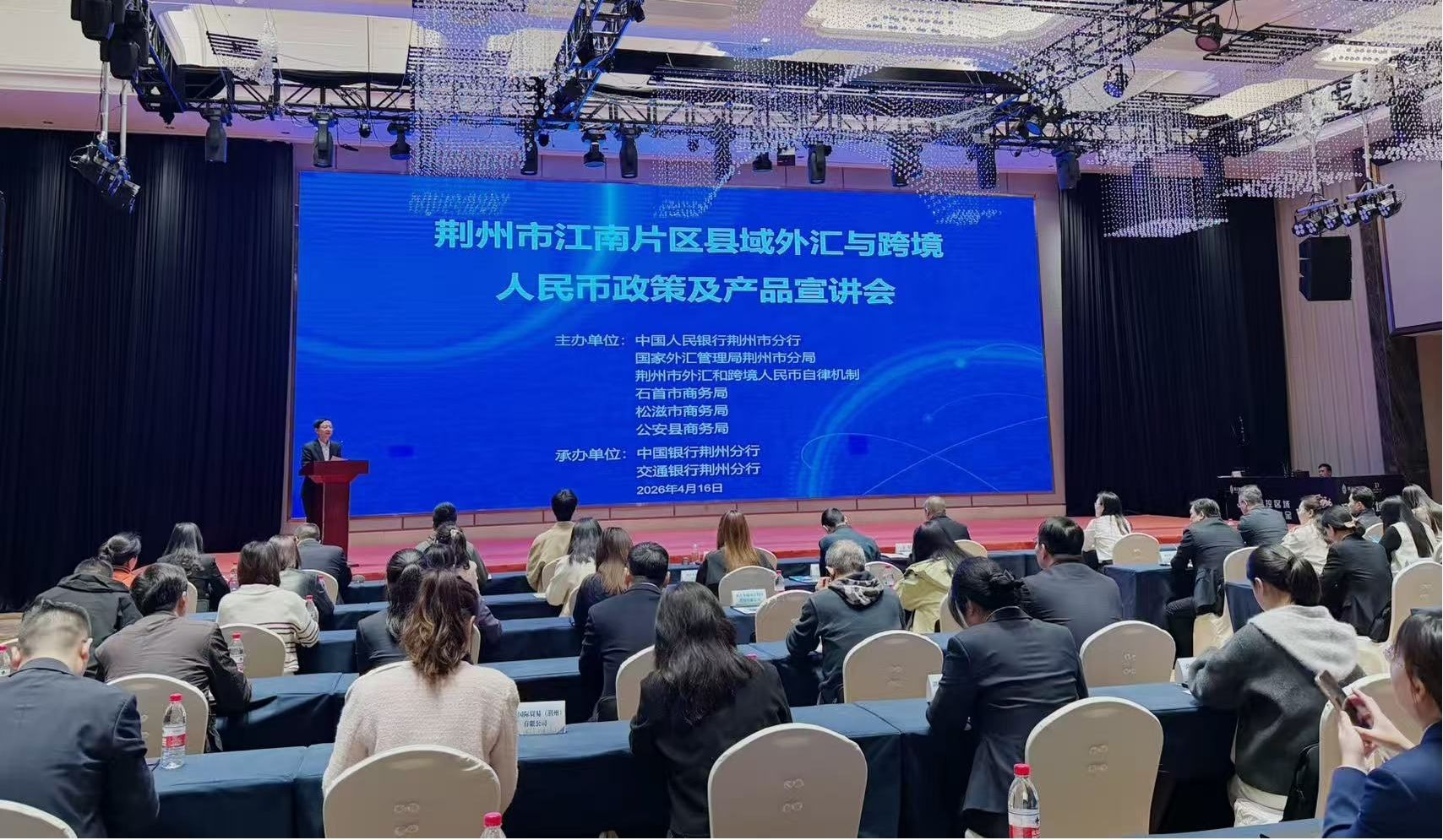 4月16日,2026年度荆州市外汇与跨境人民币政策及产品宣讲会(江南片区)在石首市顺利召开。本次活动由中国人民银行荆州市分行、国家外汇管理局荆州市分局、荆州市外汇和跨境人民币自律机制及石首、松滋、公安三个县市商务局联合主办,中国银行荆州分行和交通银行荆州分行联合承办,是湖北省外汇和跨境人民币自律机制统筹推进的县域系列宣讲活动重要一环,旨在打通涉外政策服务“县域末梢”,精准对接外向型企业需求,助力实体涉外经济高质量发展。中国人民银行荆州市分行、国家外汇管理局荆州市分局相关负责同志,中国银行、交通银行荆州分行行长,江南片区50余家外向型企业主要负责人参会。
