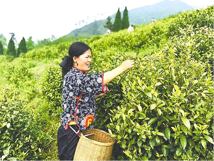 茶园深处,十几名身着蓝布碎花衣的采茶女正巧手翻飞,一芽一叶落入竹篓,成为镜头追逐的焦点。她们指尖轻捻,动作娴熟,一捏一提间,鲜嫩的茶芽便稳稳落入篓中。蜿蜒的茶垄间,几位汉服爱好者手持团扇,漫步打卡,衣袂与茶香共舞,裙裾随风轻扬,仿佛从古画中走出的采茶仕女。