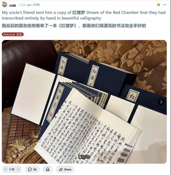 不止影视剧,还有外国网友发帖分享手抄《红楼梦》全本。帖子一出,1700多人点赞,评论区一片惊叹——