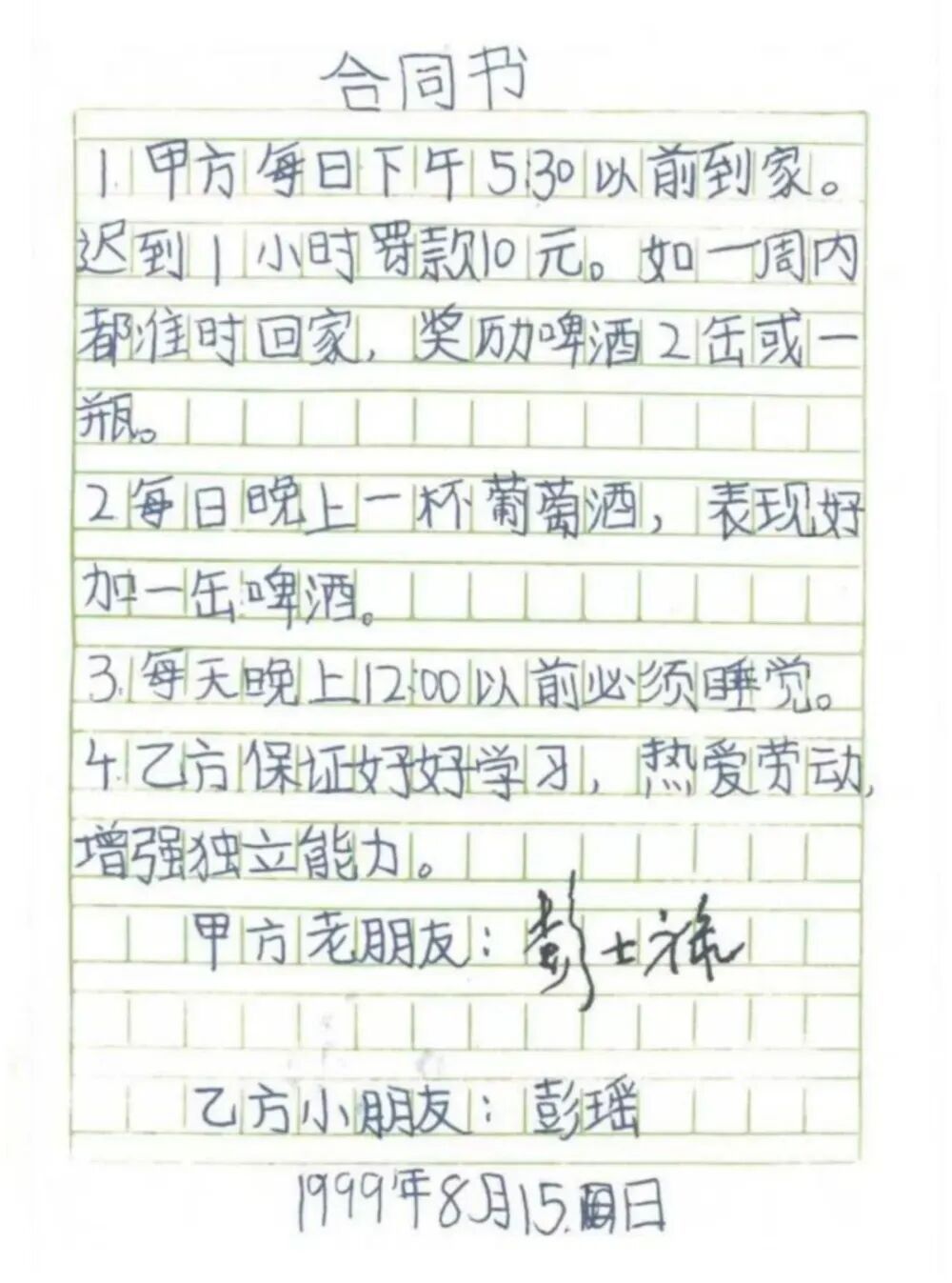 彭士禄和外孙女签订的奖励啤酒的“合同书”