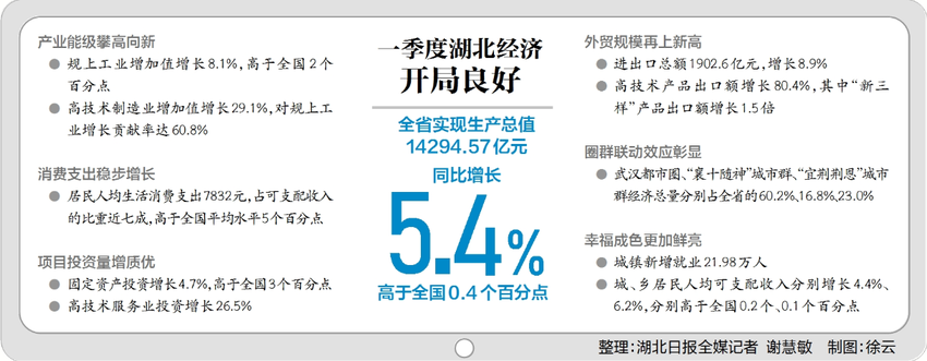 看投资,一季度,全省固定资产投资增长4.7%,高于全国3个百分点。其中,亿元以上项目本年完成投资增长10%。阜黄高铁、武汉枢纽直通线、西十高铁、汉江航道整治等一批重大项目加速推进。