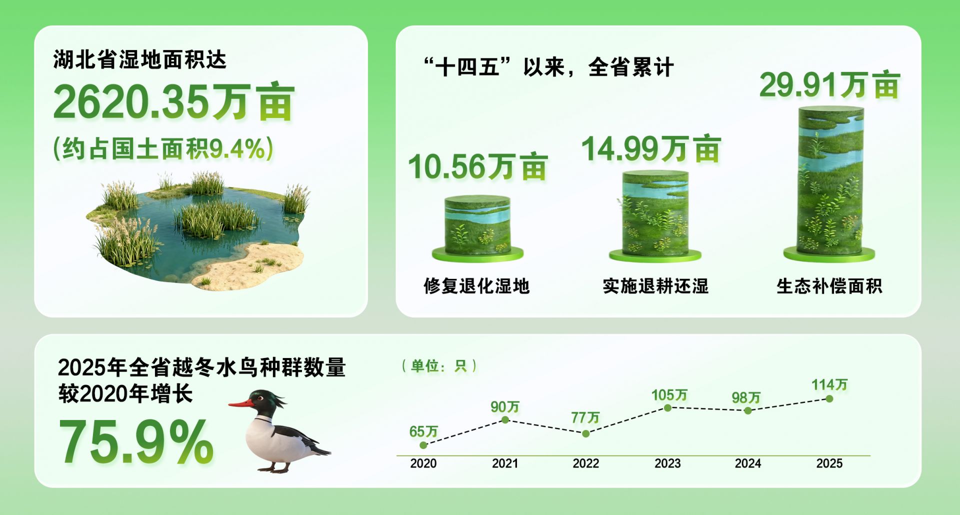 湖北将每年11月第一周设立为湿地保护宣传周;实施《湖北省湿地保护规划(2023—2030年)》,建立湿地保护联席会议制度与生态补偿机制,推动湿地保护工作从“经验治理”迈向“科学治理”。