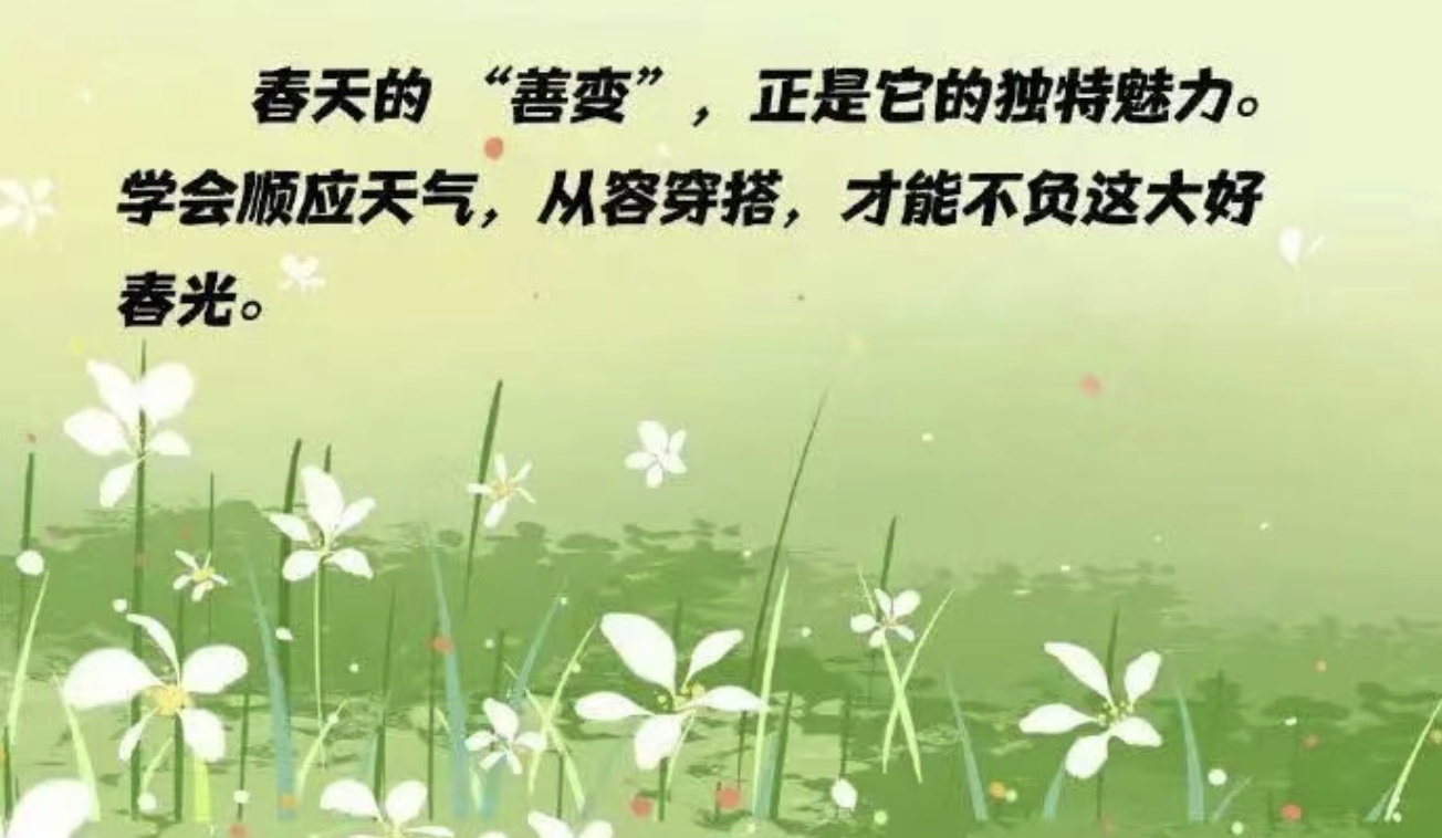 不过,对春天的善变,我们也有妙招。武汉市气象局提醒,可以早晚比中午多穿一件应对温差背心加针织衫,冷热易穿脱,时尚又保暖;减衣先减上衣,下半身保暖更重要,着装宜宽松,促进气血流通,助力阳气生发。