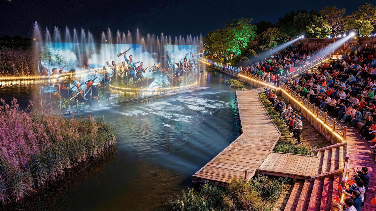 南岸主城区点亮“一河两岸”。 依托内荆河及两岸,打造“水面光影、水上巡游、水岸展演、街区烟火”四位一体夜游场景。具体包括内荆河特色灯光秀、百米凤舟水上巡游、红色主题演艺、大型无人机表演(呈现“英雄洪湖·红色水乡”字样)以及特色美食市集。其中,凤舟竹排被打造为水上流动的“洪湖非遗展览”,联动非遗馆、贝雕馆,让非遗文化活起来。