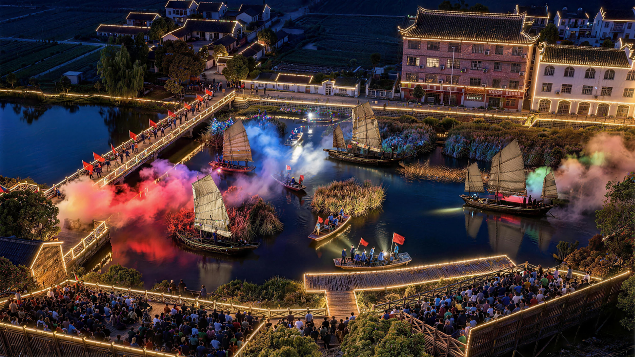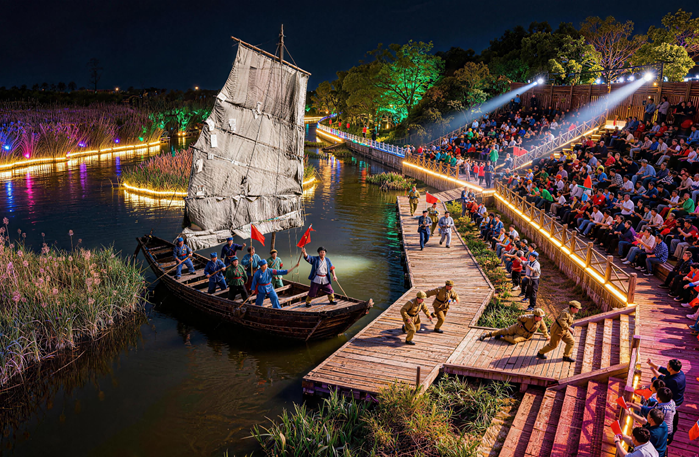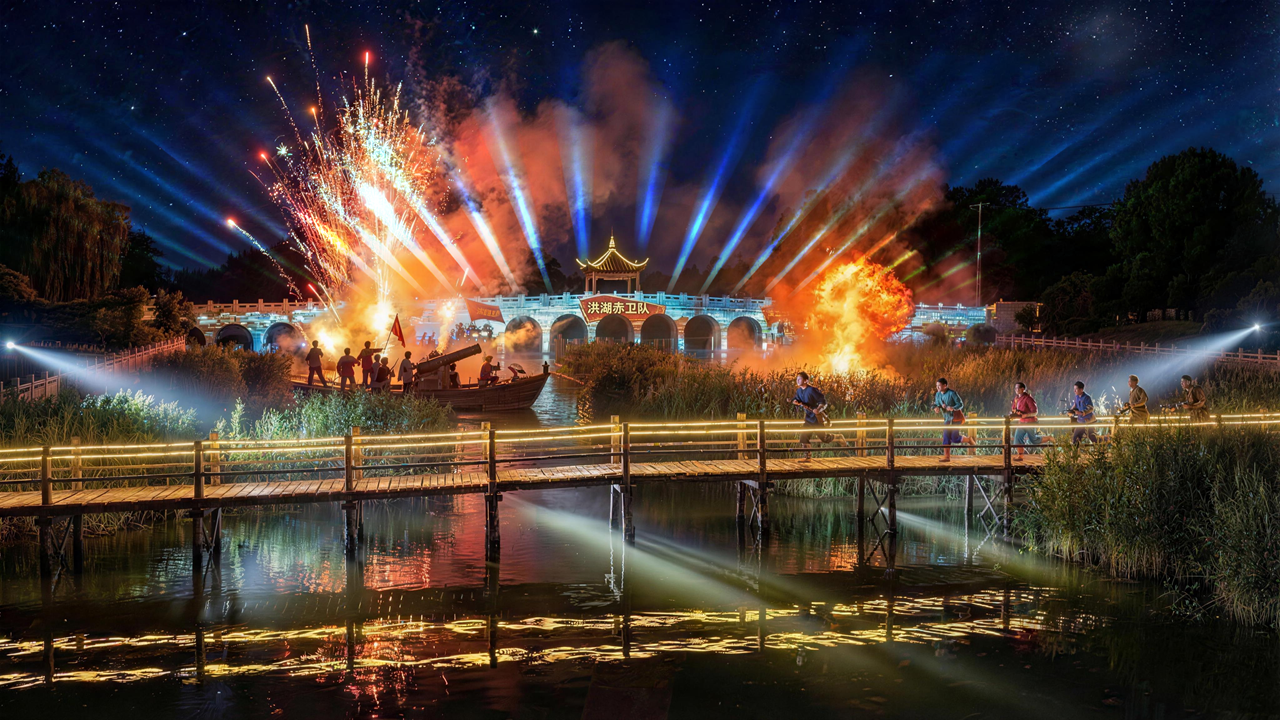 北岸瞿家湾重塑红色记忆。 洪湖市对瞿家湾21处革命旧址展陈内容与业态体系进行全新升级,推出行进式实景演艺、水上实景战斗项目,还原《这一仗打得真漂亮》等经典场景;搭配渔家宴美食餐秀,推出红军街夜游灯光秀,形成昼夜联动的红色游览体验。