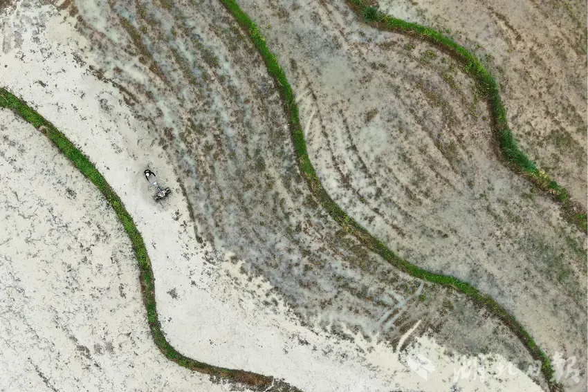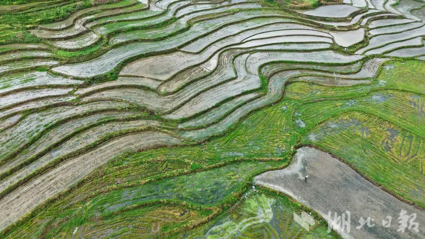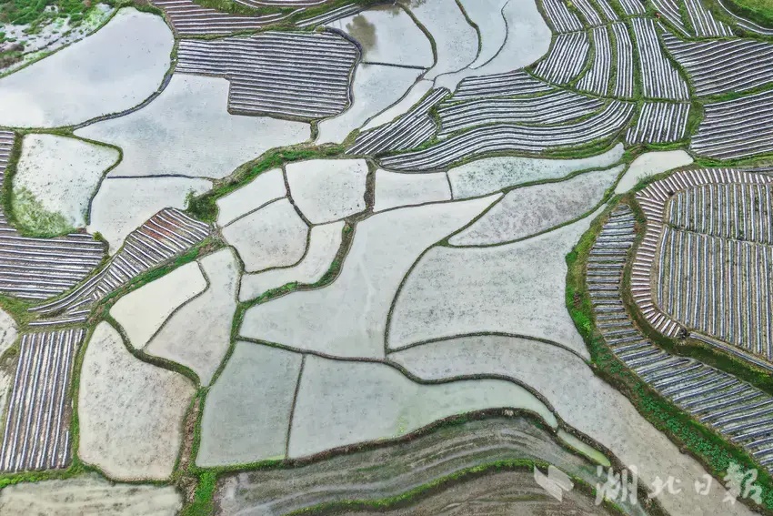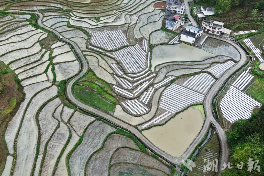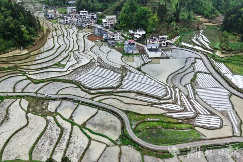咸丰县坪坝营镇土司坝村有集中连片梯田100多亩,咸丰县广野粮油商贸有限公司通过土地流转、集中种植,让村民在获取土地租金的同时,就近务工,增加劳务收入。谷雨时节,市场主体与当地村民一起,抢抓农时,整田插秧,田间地头一片忙碌景象,灌满水的稻田如一面面形状各异的镜子,线条舒展的田埂好比写在大地上的诗行,梯田与民居、山峦、河流、公路相映成景,美如画卷。(湖北日报客户端通讯员李维君、熊辉)
