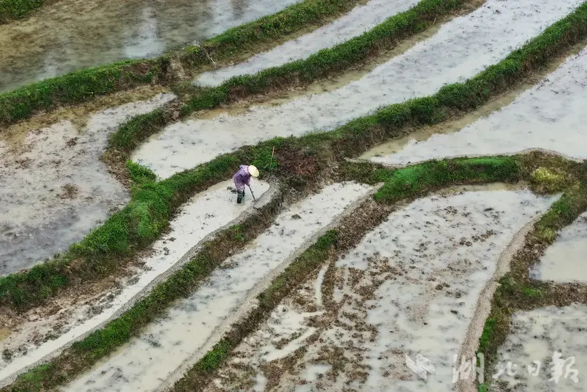 谷雨时节,咸丰县坪坝营镇土司坝村的田间地头随处可见村民忙碌的身影。村民抢抓农时,整田插秧,灌满水的稻田如一面面形状各异的镜子,线条舒展的田埂好比写在大地上的诗行。