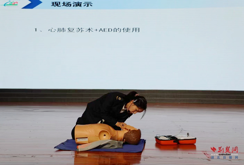 黄冈市急救中心李雪芹老师讲解心肺复苏、AED 使用和海姆立克急救法,用真实案例说明“黄金4分钟”的重要性,教给学生紧急情况下的自救互救技能。