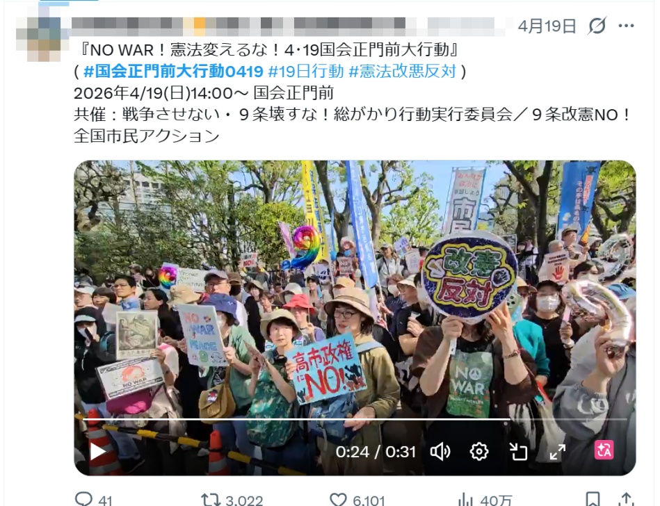 不过,修宪程序门槛较高,需在日本国会两院获得三分之二支持及公投半数同意。从当前政治格局来看,尽管执政的自民党掌握优势,但修宪仍面临程序与民意的双重考验。近期的抗议活动团结了日本不同世代的民众,日本共同社基于手机定位数据分析,在4月8日东京举行的一场集会中,30岁左右人群占比最高,20岁左右群体超两成;在性别方面,女性参与者约占60%。东京上智大学政治学教授中野浩一对《卫报》表示,美以对伊战争和特朗普反复无常的行为模式促使年轻的日本人公开表达自己的观点。“中东战争让人们意识到,在高市领导下,日本可能会卷入一场非法战争……因此,更多的人感到他们有必要表明对宪法第九条的支持,因为这是抵御战争的最后一道防线。”(胡晓薇)