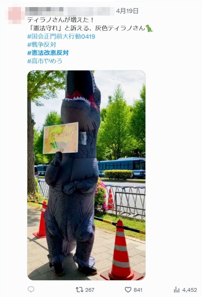 身穿恐龙服的日本民众手举“守护宪法”标语牌
