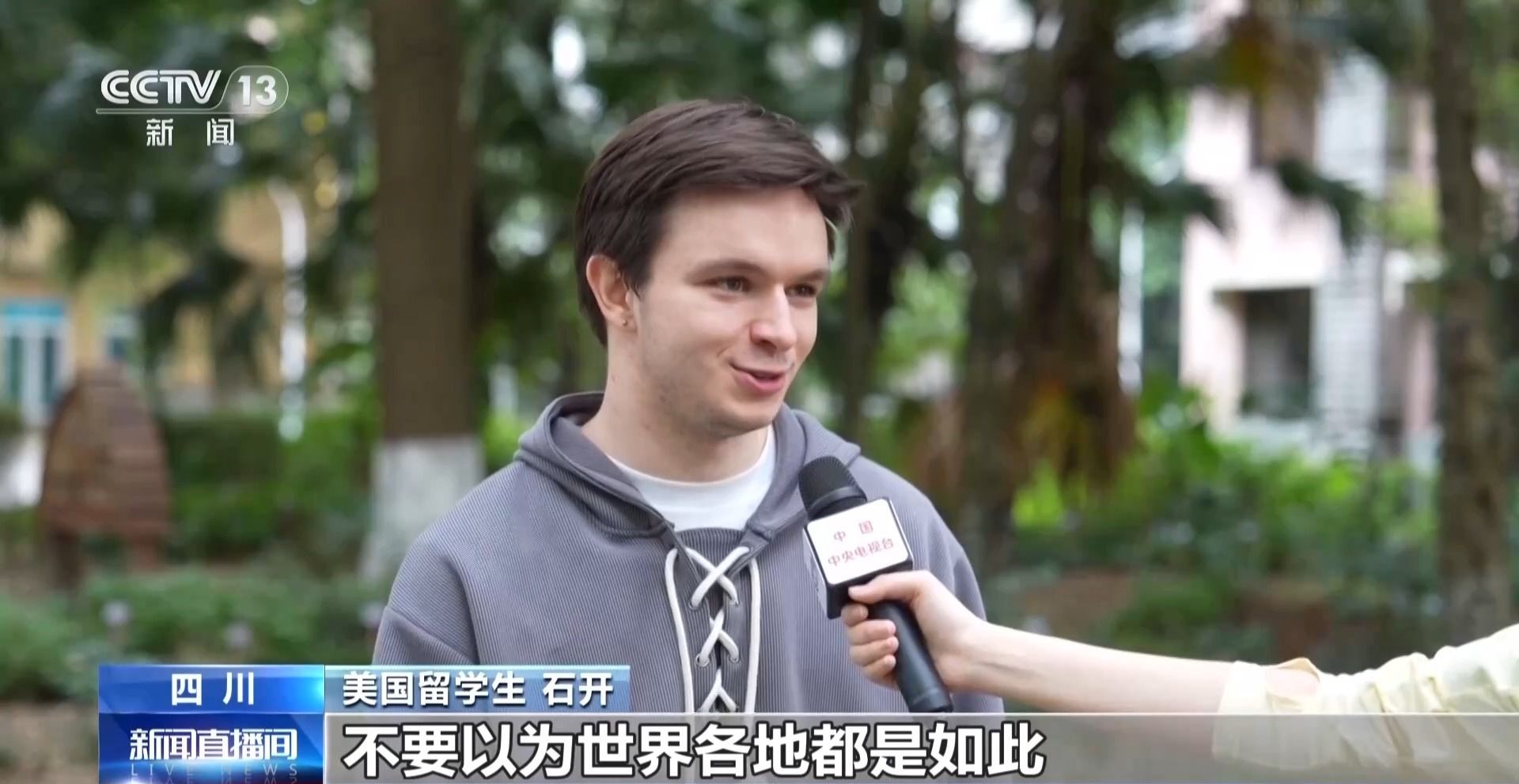 美国留学生 石开:我来中国8个月,无论白天晚上出门,都不用担心自己的安全。不要以为世界各地都是如此。中国是一个很安全、很安逸的地方,让人能充分享受生活。