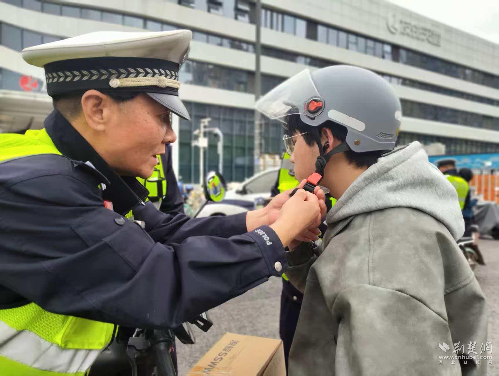 早高峰的高新大道光谷三路路口,东新交警设置了爱心头盔发放点。一位头盔戴得松松垮垮的驾驶员被拦下,民警一边帮他调整卡扣,一边幽默地说:“不然真到用的时候,它‘擅离职守’可不行。”对于未佩戴头盔的骑乘人员,民警在警示教育后免费赠送了一顶新头盔。展板上的事故案例漫画让一位外卖小哥驻足良久:“平时送单赶时间,确实容易忽视安全,看得人后背发凉。”当日,东新大队共发放宣传资料1000余份,赠送安全头盔70顶。