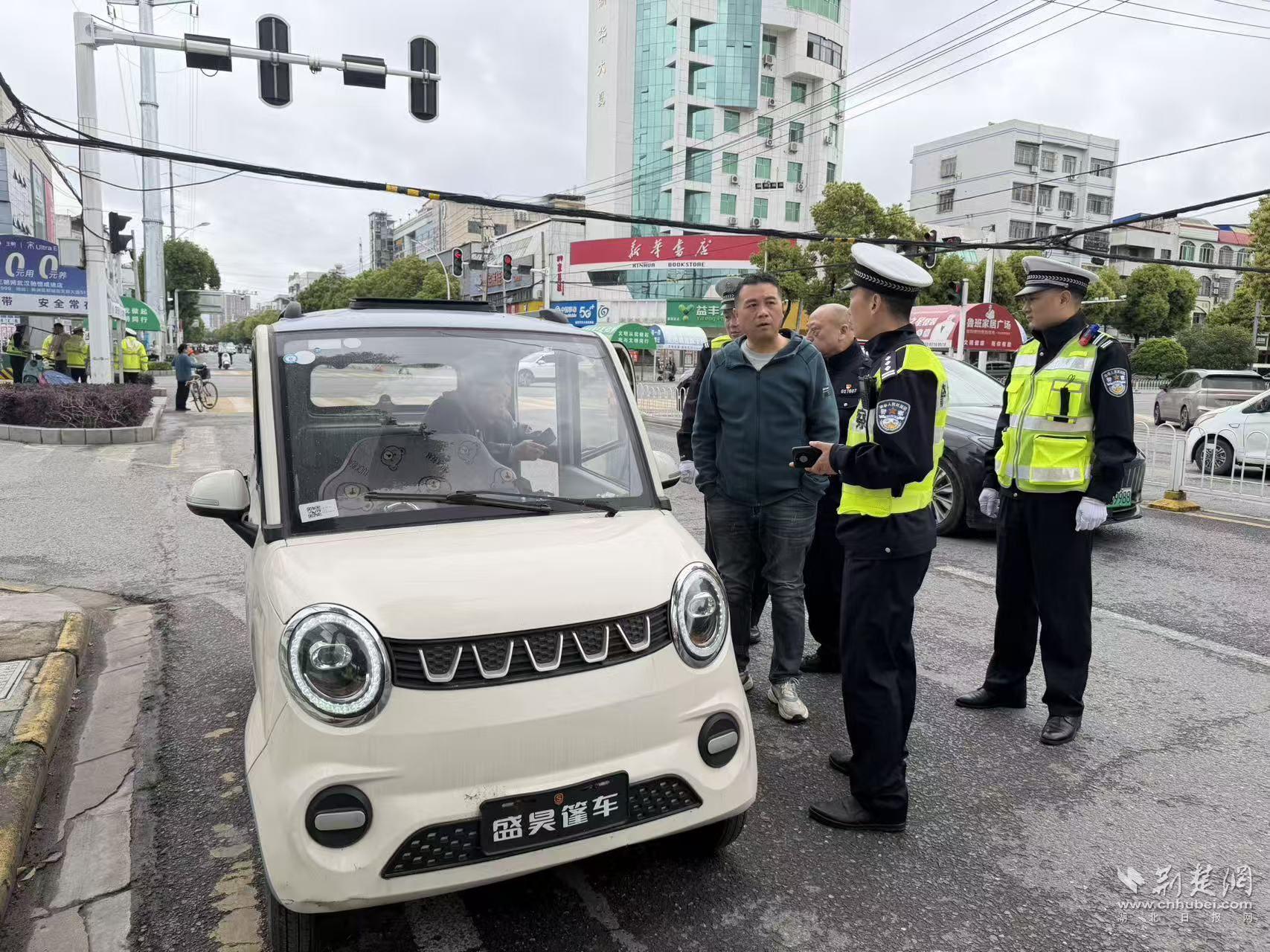 新洲大队在幸福时代小区门口,三中队副中队长李顺林拦下一辆无牌无证的“老头乐”,向群众讲解:“这种车没牌照、没保险,刹车和防护都不达标,真出事了害人害己。”当日新洲还查处货车非法加装强光灯、超载等6起,酒驾2起,同步查扣违规“老头乐”,严厉整治货车违法。