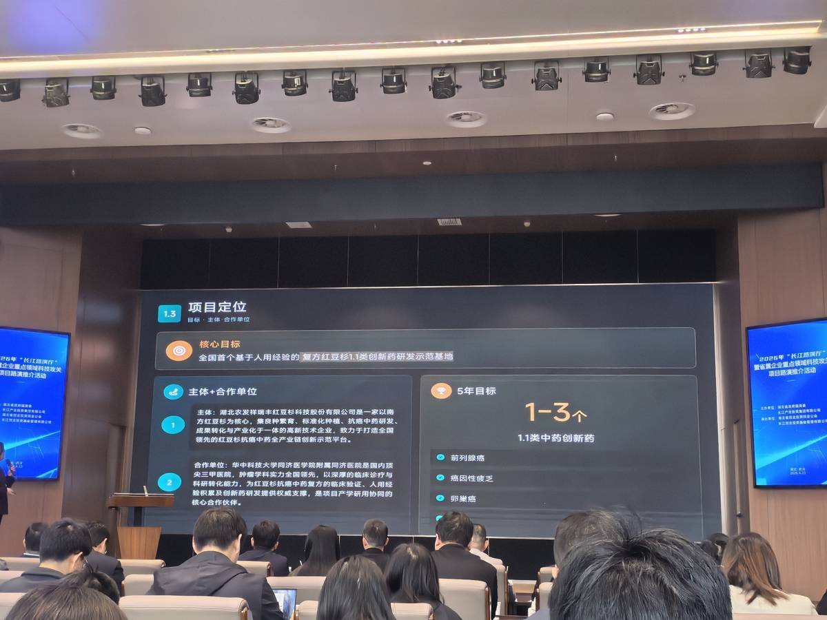 现场发布人介绍,红豆杉是“植物界国宝”,里面的紫杉醇能抗癌,是抗癌药物的重要来源。这个项目,就是要把这种药材做成创新中药,专门给肿瘤患者,提供新的中医药治疗方案。为了做这个药,要投入1.5亿元,还要种2000多亩药用红豆杉林,建100亩种苗繁育基地。项目前景好,早已被投资方看中,湖北科创板服务中心相关负责人直言:“已经投过了。”