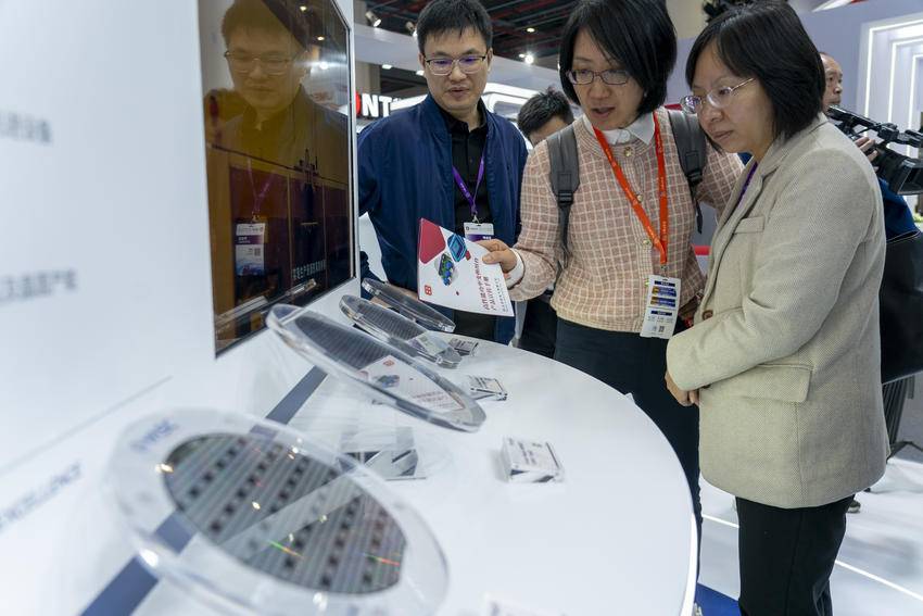 长飞先进展台,观众参观晶圆产品。(湖北日报全媒记者 魏铼 摄)