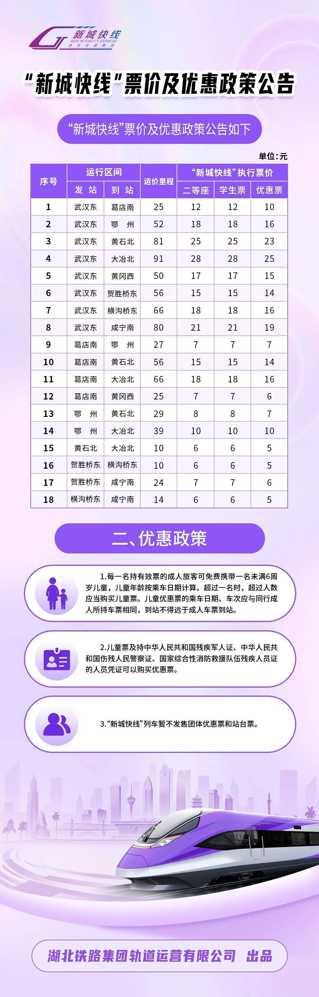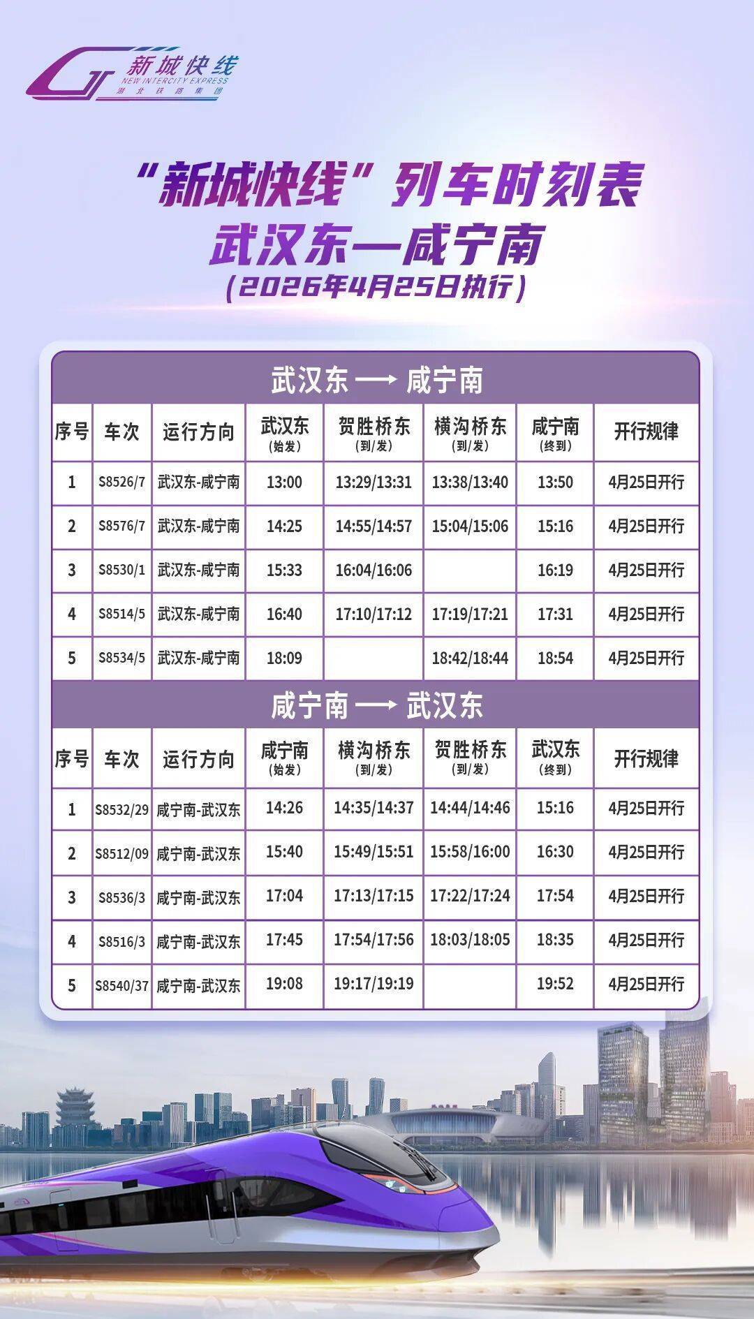 武咸“新城快线”从武汉东站始发,终点是咸宁南站,沿途停靠贺胜桥东、横沟桥东等站点。湖北铁路运营公司相关负责人介绍,除了班次密集、票价亲民外,与咸宁北站相比,咸宁南站离咸宁市区更近,更方便群众出行。