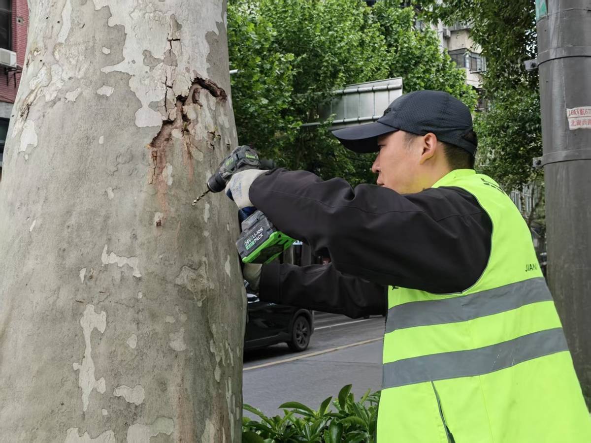 湖北日报讯(记者张竞恒、通讯员李军、申燕伟)4月24日上午,在武汉市江汉区北湖西路,几名绿化工人围着一株法桐忙碌。一人手持电钻,在树干离地约1.3米处斜向下钻出小孔,另一人取出一瓶药剂,旋盖、刺破封口、插“针”,将“针头”稳稳插入孔中,让药液缓缓注入树体。这是江汉区城管执法局今年治理法桐飘絮的新试点:为法桐注射“飞絮抑制剂”。