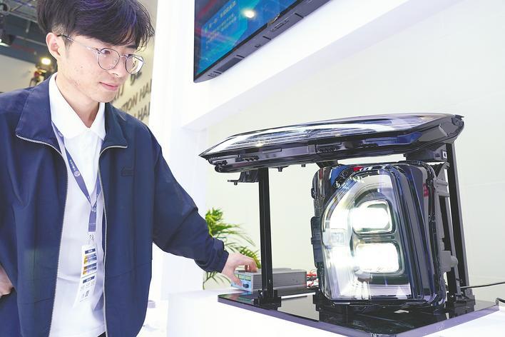 展台上的新型智能投影车灯。(湖北日报全媒记者 魏铼 摄)