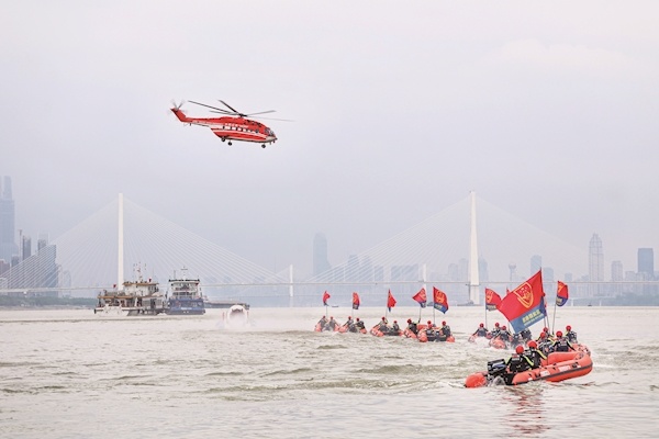 4月24日15时,2026年武汉市“应急使命”防汛抢险救援综合演练,在洪山区天兴洲长江水域拉开序幕,5支队伍、1100余人次开展实战练兵。此次演练是武汉市首次在道路承载力弱、装备受沙尘影响大的长江沙洲区域开展防汛实战化综合演练。参演装备专业化程度高,不仅调动了直升机、大型无人机、硬质机动路面机、水面拖轮、起吊装备,还首次将人行便桥、充气式挡水子堤等一批新型实用装备投入实战应用。