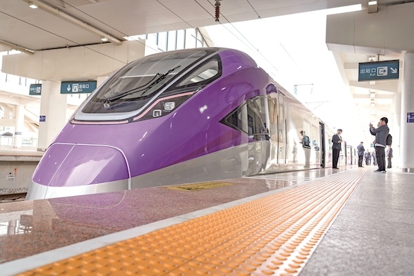 4月25日,武咸城际铁路公交化运营的“新城快线”正式开通。从武汉到咸宁最快仅需45分钟,票价21元。当天上午9时30分,一列采用银紫靓丽涂装的CINOVA 2.0型城际市域智能列车,缓缓驶出武汉东站,向着咸宁南站平稳进发。极目新闻记者在列车上看到,车内配备有无线充电功能的小桌板、无障碍卫生间、自动售卖柜等设施,让旅客的乘车体验全方位升级。