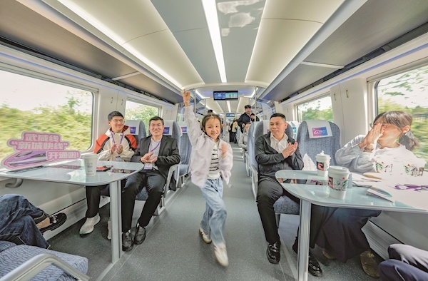 市民游客高兴登上新列车