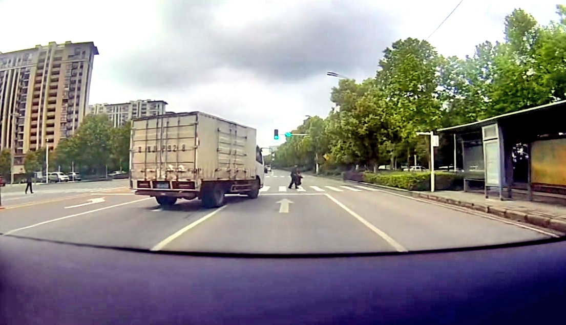 货车压实线右转,让女子和孩子平安穿过马路 视频截图